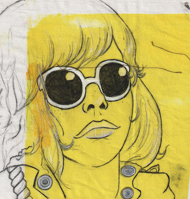 Moving on, the piece was done on a piece of scrap fabric I found in the store cupboard, it was a perfect little square of cloth that someone had tried to dye yellow and completely missed the corners which made it look lovely and like it needed something drawn into it. The drawing itself was done with a thick black multi-liner and then I used a white gel-pen to add some details such as freckles and hair.